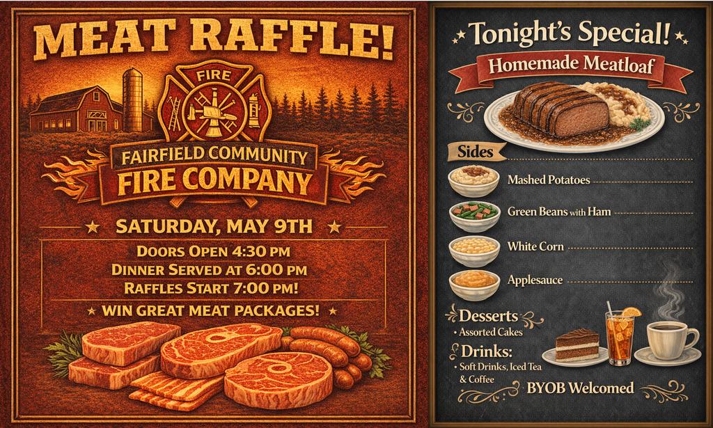 Doors open at 4:30 PM, dinner is served at 6:00 PM, and the Meat Raffle begins at 7:00 PM. We will have non alcoholic beverages available, but if you would like to BYOB you are more than welcome to do so.